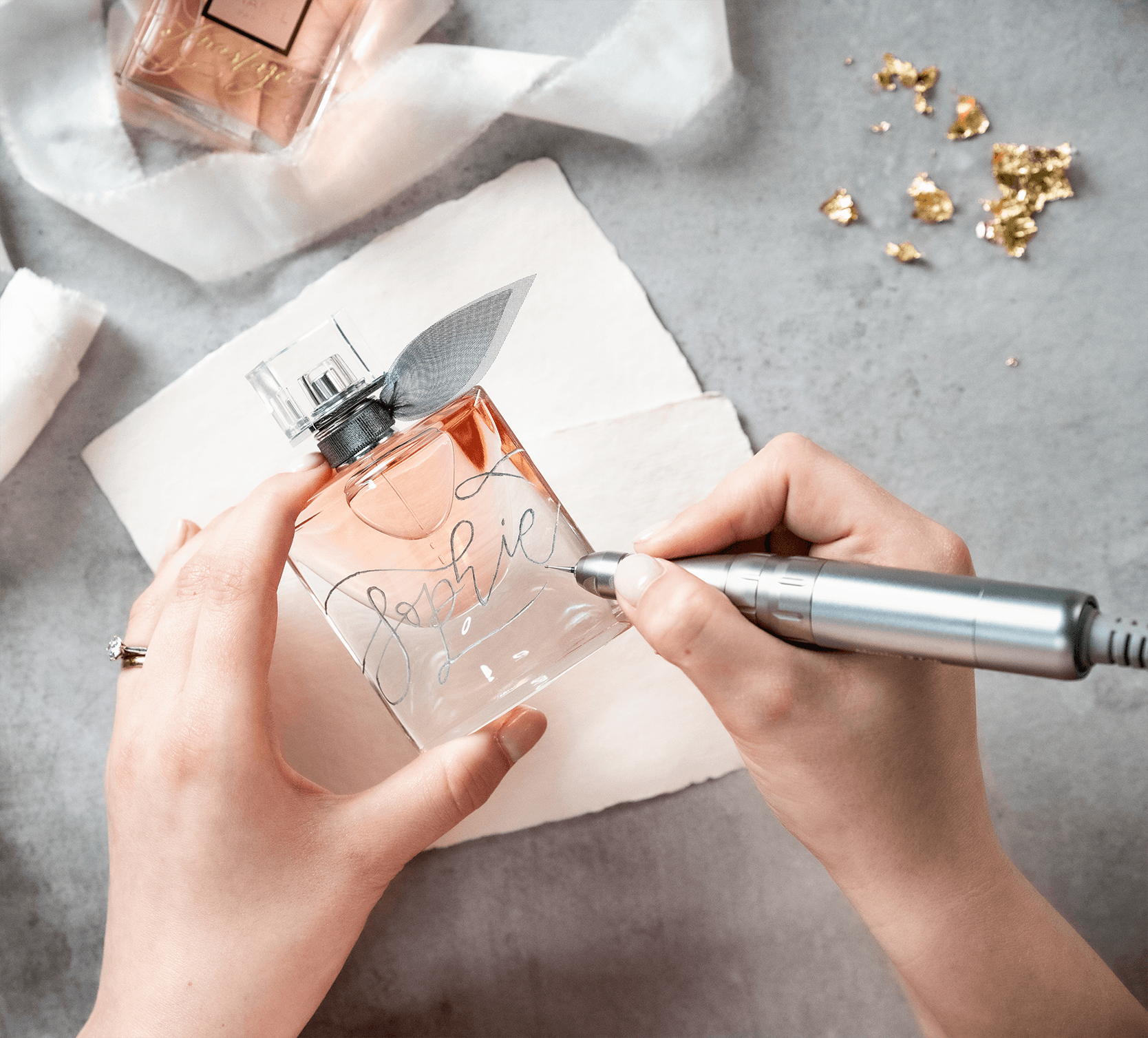 To name a few: perfumes, lipstics, wine bottles, whisky bottles, champagne and wine glasses, silver spoons, thermoses (those look amazing!), luggage tags, journals, pens, even bike frames. We also preserve the lost art of gun engraving - we can engrave your hunting rifle, shotguns, or pistols.